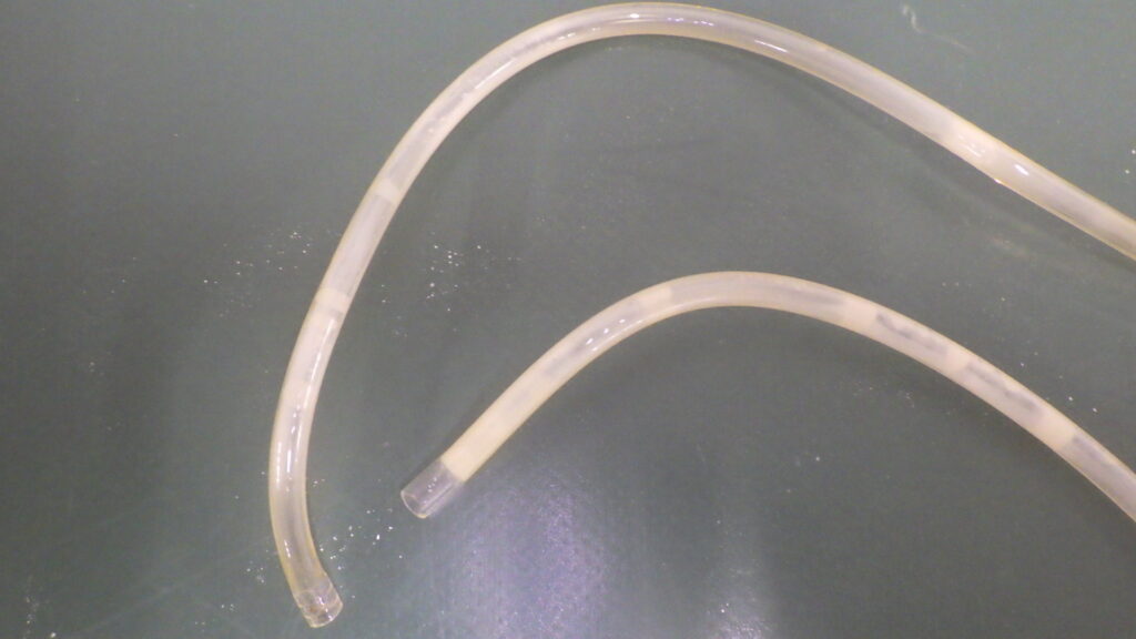透明なホースが所々に白くまだら模様となっています。白くなっている部分は薬剤が残り固化しております。