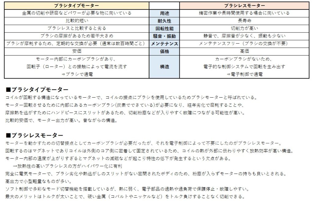 ブラシタイプとブラシレスタイプの違いについては以下の通りです。