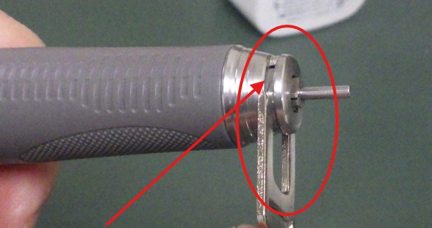 レンチを差し込む溝の中の穴を見ていただき、バーを手で回して平らな面が出てきたらレンチを差し込んでください。