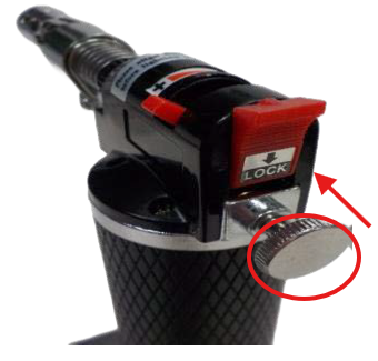 1.底面よりガスを注入後に、セーフティーロックを解除し空気調整ダイヤル部を回し穴の開くところまで回転させます。