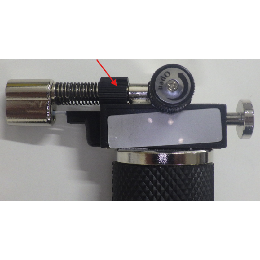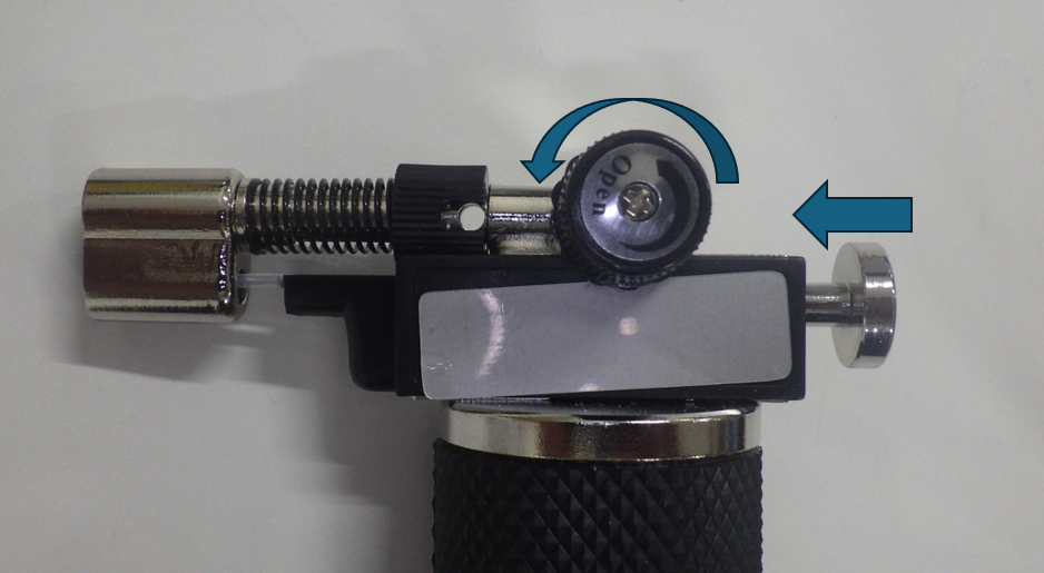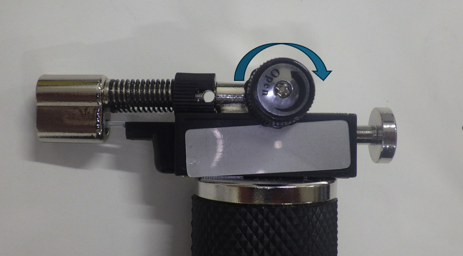 ②ガス調整ハンドルを反時計方向に回転させるとシューっと音がしてガスが出てきます。(回転は少量で構いません。)